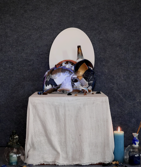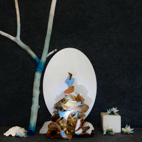 I enjoyed the idea of limiting on myself to creating with pieces of pottery or glass that used to belong as one piece. It was interesting to decide what other ways they could fit together to make something entirely new