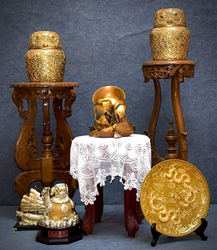 The art material I selected for this piece was spray paint. When the sheerness of is combined with the semi-circle that decorates the top of the sculpture, it produced the semblance of something bold and expensive. The title is a playful hint at what the photo portrays: a sculpture composed of “trash” but is hidden in plain sight. All that glitters is not gold. The display was arranged to emulate the sort of paintings once used by royalty to communicate their wealth, land and possessions.