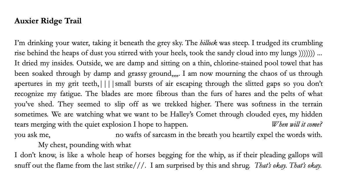 “Auxier Ridge Trail” is a lyric meditation on emotional exhaustion, intimacy, and the erosive beauty of shared experience within a natural landscape.